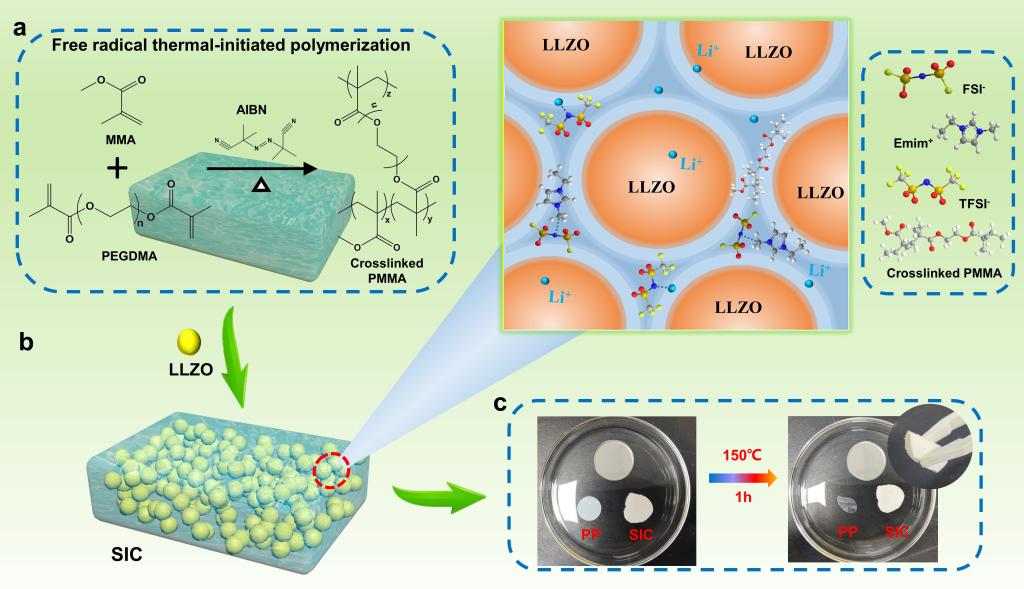 图1 (a)自由基聚合反应. (b) SIC电解质的设计示意图. (c) SIC电解质与商用PP电池隔膜的耐热性比较.