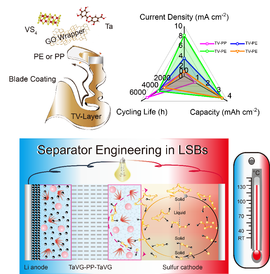 金属锂被认为是下一代高能量密度电池器件的理想负极材料,国家十四五规划更是提出基于金属锂负极研发能量密度达600Wh/kg的颠覆性电池技术。但要实现该发展战略目标,目前的锂负极还面临诸多挑战,特别是锂枝晶和“死锂”形成所导致的性能衰减、短路甚至热失控等问题。对电池体系而言,高比能锂硫电池是未来高能化学电源的重要候选体系之一。但锂硫电池除存在前述锂负极侧的共性挑战外,硫正极侧还面临反应动力学缓慢、多硫化物穿梭和活性硫损失等多重复杂问题。因此,如何用简便且实用化的方案一劳永逸的解决这些挑战,成为以金属锂为负极研发高性能金属锂电池的前沿课题和关键核心技术。