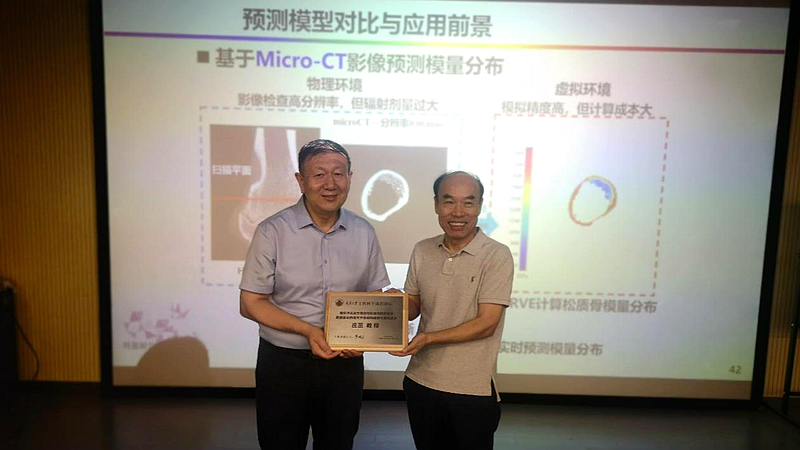 在《爆炸冲击波生物致伤机理与防护技术》报告中,庄茁教授首先提出了爆炸冲击波生物致伤和防护机理,然后建立了微结构聚合物复合材料衰减冲击波理论模型和计算方法,揭示了材料散射、共振、粘性对冲击波能量的衰减机理,在此基础上指导了新型聚合物材料的设计和制备。最后基于生物激波管和现场实爆大动物试验,评价了冲击波生物致伤和防护效能。在《数据驱动的围关节骨结构建模与重构技术》报告中,庄教授提出了个性化围关节骨结构的理论模型,揭示了骨结构的非均质各向异性力学特点。并通过纳米压痕试验和数据驱动,建立了微观CT骨小梁分布与普通CT等效模量的关系,借此实现快速准确地预测骨结构性能,并结合可降解增材制造技术,可用于指导围关节骨缺损的临床精准治疗。