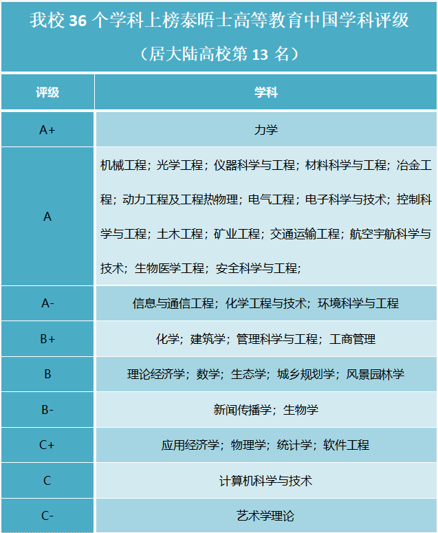 有36个学科入榜,包括18个A类、12个B类、6个C类,居大陆高校第13名。