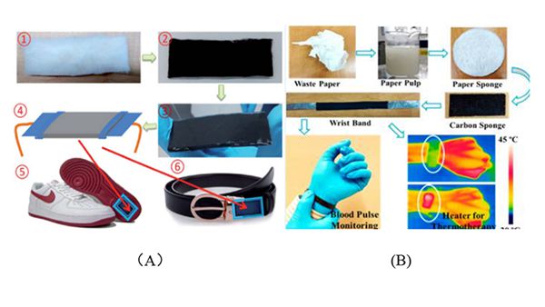 图5.(A)基于棉花的压力穿戴器,(B)基于废纸的多功能手环。