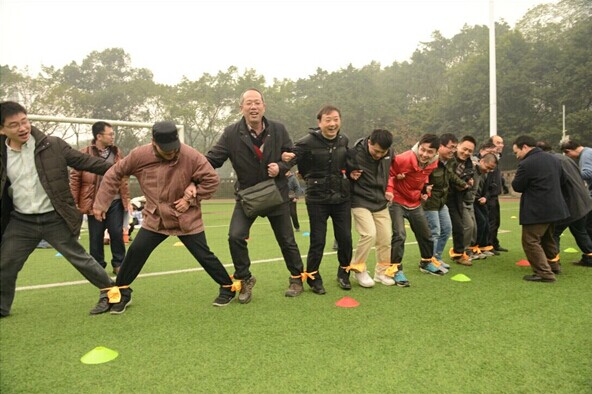 例如“纵”志成城一项,老师们以每组10人纵队的形式站立,用绳子绑腿,以横着走的形式向前移动,赛程50米,以每组的最后一名队员跨入终点线计时停止,用时最少队获胜。由于每人的双腿都与队友牢牢绑住,移动极为不便,老师们想了各种办法——有提议喊口令的,有建议挪碎步走的,还有的组在比赛中走着走着,原本的一排直线变成了S型,短短50米距离,大家走得实在辛苦。