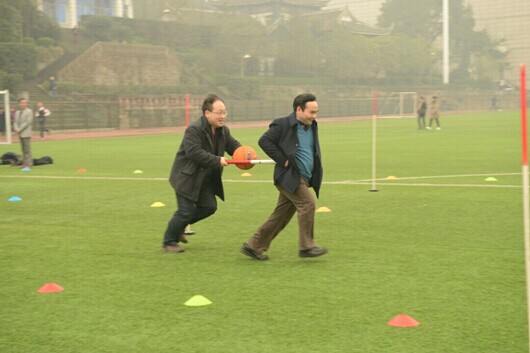 滚铁环是很多老师童年的美好回忆,但在草坪上,圆滚滚的铁环就不那么听话了。在技术娴熟的老师们手中,铁环还算听话,但在大部分老师手中,铁环都如醉汉般蜿蜒行进。为了争取时间,大家也各显神通:有的老师将铁环一股脑先溜出去再追,有的老师几乎是用铁丝拖着铁环在跑,还有的老师跑着跑着,突然发现铁环已经滚到了操场外。围观的老师们则在一旁指点江山,时不时被选手们的精彩表现逗得乐不可支,笑声在操场上久久回荡。