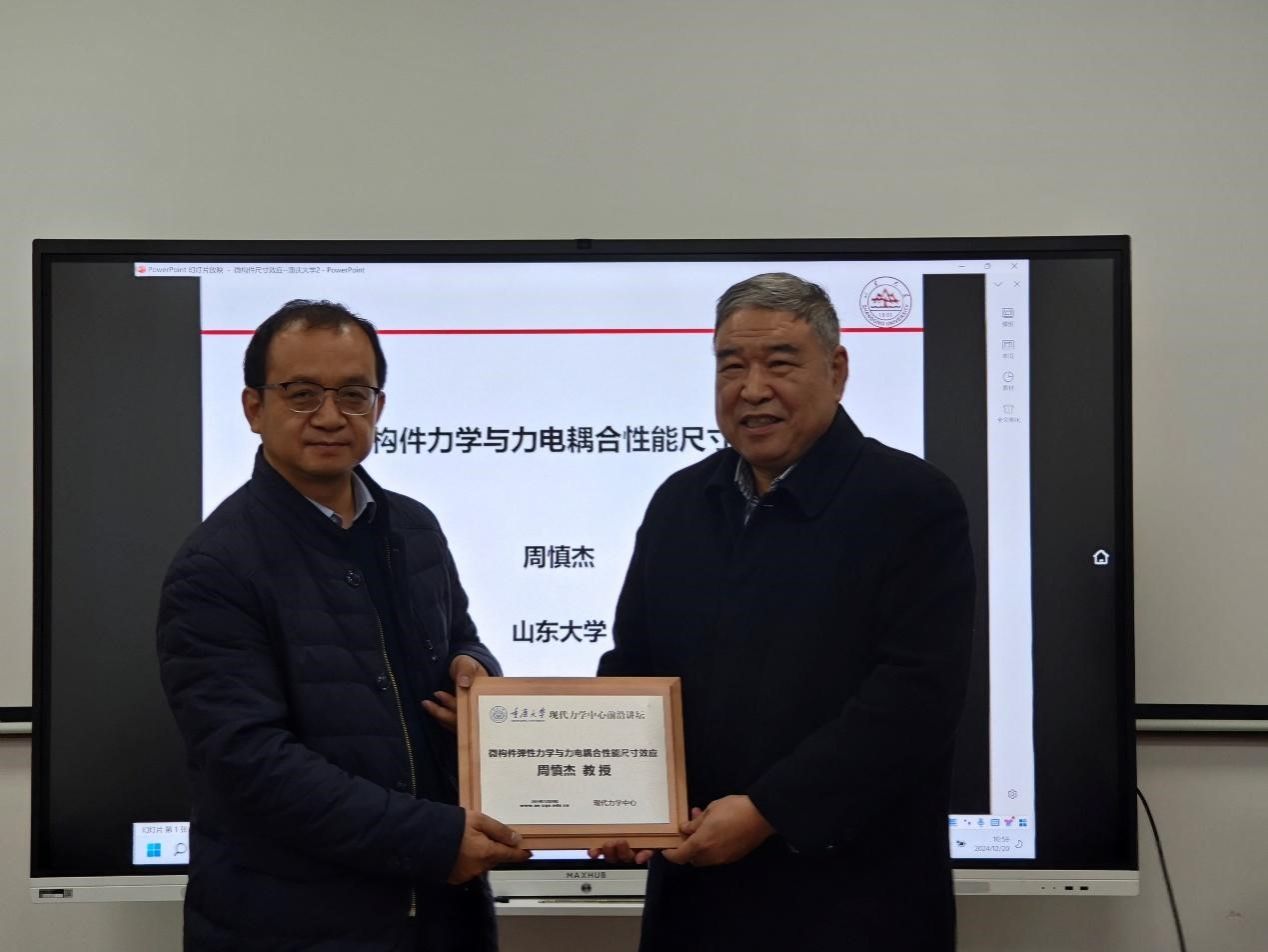 周慎杰教授的介绍引起了师生们的热烈讨论,大家纷纷踊跃发言,周教授对大家的问题做出耐心且详细的解答。随后,李卫国代表现代力学中心向周慎杰赠送了纪念奖牌。此次学术交流为学院师生深入了解微结构力学性能问题及其应对策略的机会,激发了大家对于科学研究的浓厚兴趣与热情。最后,报告会在热烈的掌声中结束。