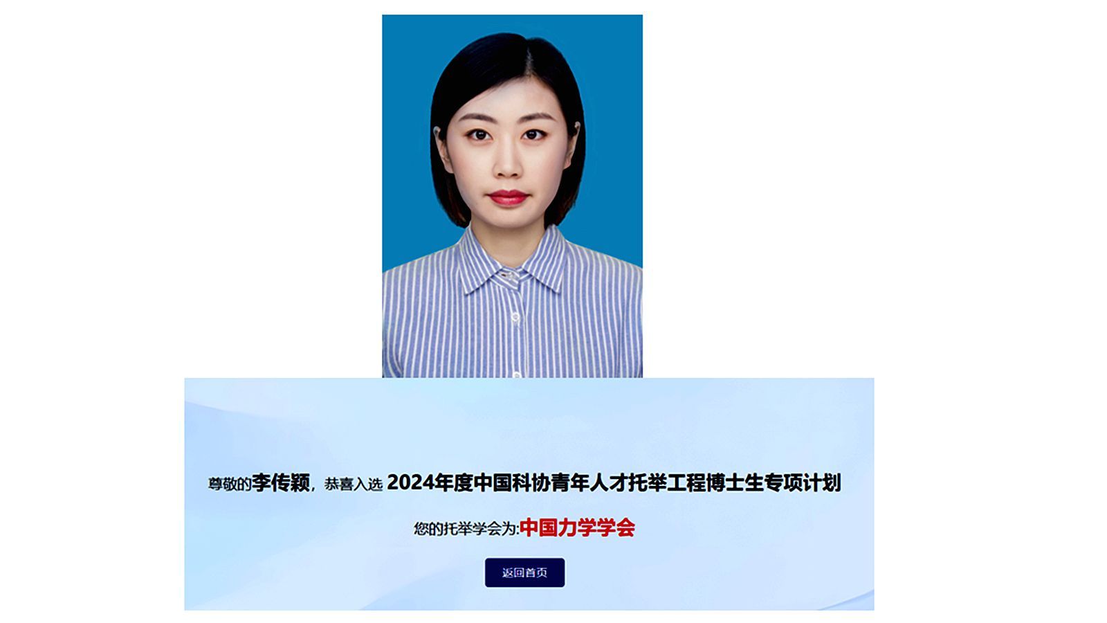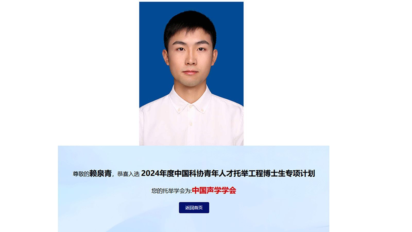 近日,中国科协公布2024年中国科协青年人才托举工程博士生专项计划入选者名单,我院博士研究生李传颖(托举学会:中国力学学会)和博士研究生赖泉青(托举学会:中国声学学会)入选该专项计划。