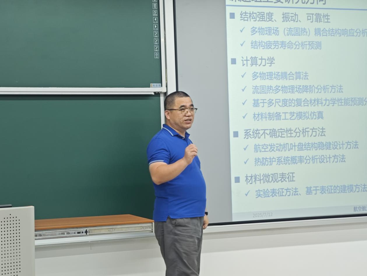 学院副院长(主持工作)李卫国教授介绍了团队在极端条件下材料力学行为领域的前沿成果;许才彬研究员分享了超声检测与成像课题组的研究进展;黄培副教授展示了航空航天复合材料团队的研究成果;副院长姚建尧教授介绍了航空航天结构强度、振动、可靠性相关研究;副院长曾忠教授以计算流体力学为切入点,介绍了学院在流体与复杂系统力学领域的前沿研究进展。