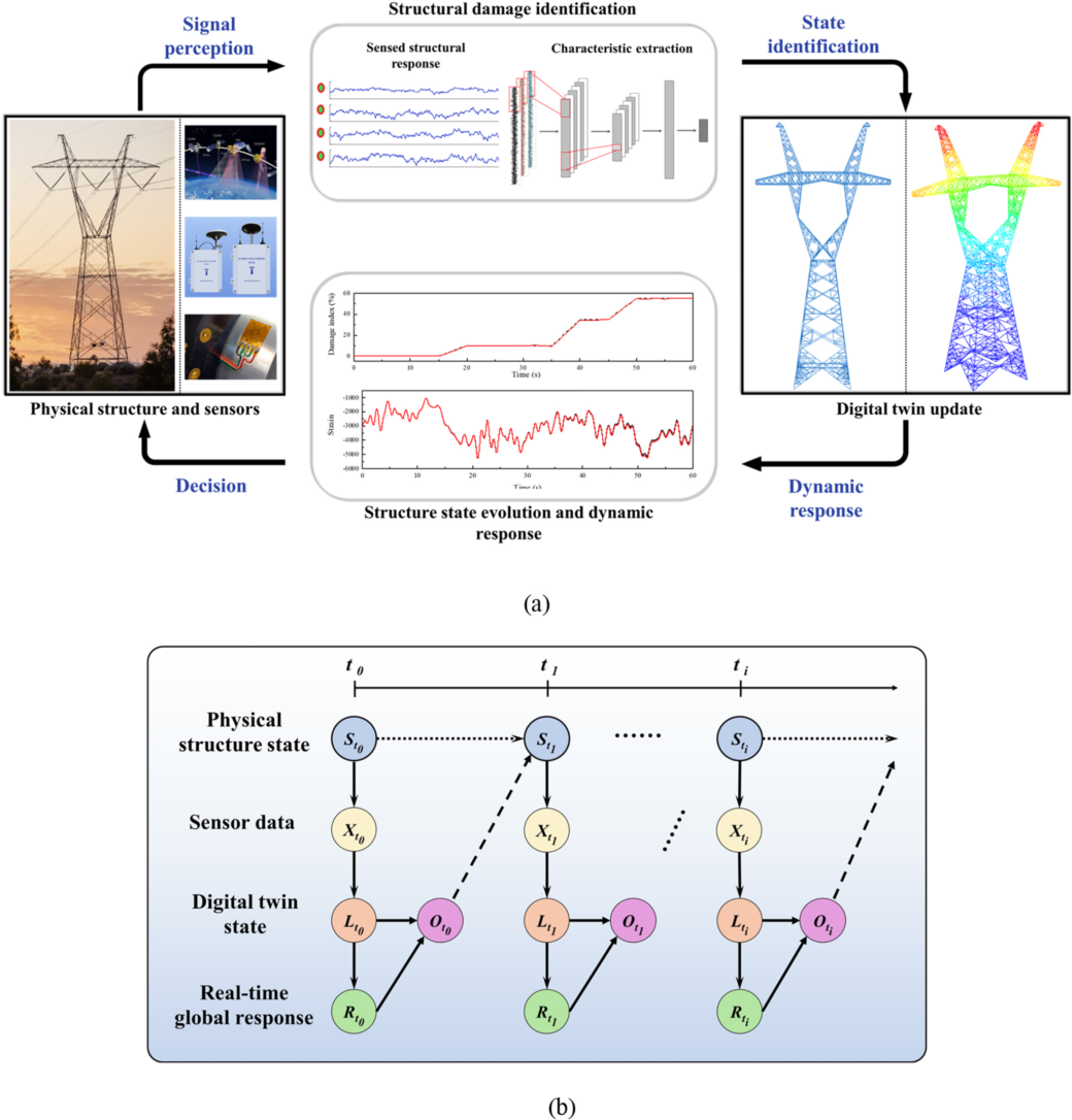 Framework of digital twin for dynamic structure. (a) Physical structure and its digital twin; (b) Evolution of digital twin with physical structure.