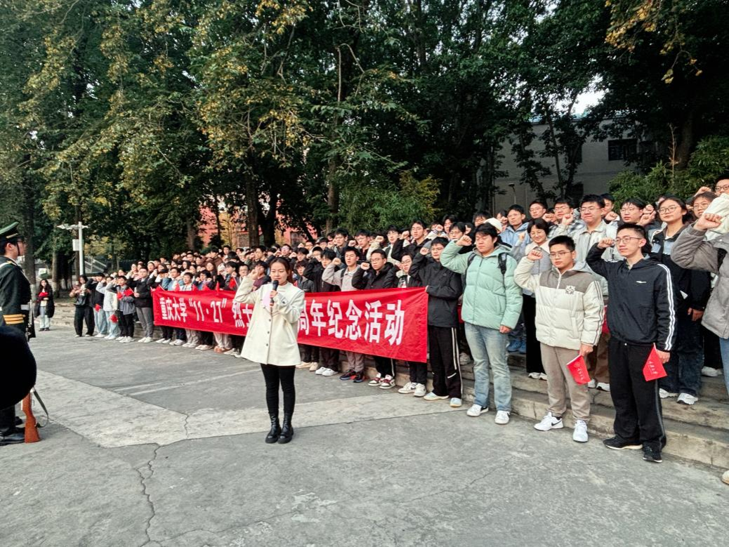 沙坪坝校区与科学城校区同步举行纪念“11・27”烈士殉难76周年升国旗仪式。其中,沙坪坝校区的仪式由动漫AV