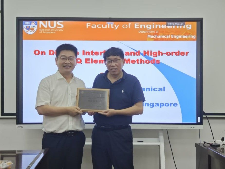 工学部前沿论坛的纪念牌。最终,讲坛在热烈的掌声中成功闭幕,与会师生纷纷与舒昌教授合影留念。
