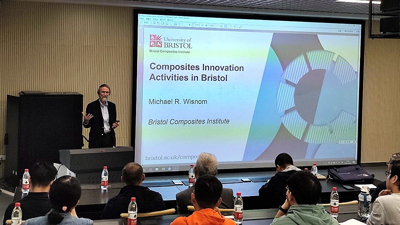 严波代表学院对Wisnom院士的访问表示热烈欢迎,并对报告人作了简要介绍。Michael R. Wisnom院士,英国皇家工程院院士,世界著名的纤维增强树脂基复合材料专家,是复合材料力学、断裂机制、失效准则与有限元分析及工程应用世界领衔权威,英国机械工程师学会和美国复合材料学会的Fellow。Wisnom教授本科毕业于伦敦帝国理工学院,博士毕业于布里斯托大学,曾在英国航空公司(British Aerospace)民用航空部门工作。1987年加入布里斯托大学作为航天器结构方向讲师,1995年成为航空航天结构教授。2006年牵头创立了英国布里斯托复合材料研究院(Bristol Composites Institute, BCI); 2007年牵头创立了劳斯莱斯全球唯一的复合材料大学技术中心(RR-UTC)并任中心主任至2017年; 联合英国龙头企业(空中客车、劳斯莱斯、维斯塔斯 等)创建了英国国家复合材料中心(NCC)并任学术委员会主席; 2009-2011年间担任复合材料国际委员会(ICCM)主席; 是复合材料顶尖期刊Composites Part A杂志主编,国际复合材料委员会World Fellow、2005年获得皇家学会沃尔夫森研究奖 (领域突出贡献奖), 迄今为止发表科研论文500余篇。