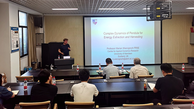 Marian Wiercigroch院士的报告首先探讨了摆系统的复杂动力学行为,以分析振动能量收集和振动隔离。他着重介绍了一种新型能量转换概念,其主要涉及通过单摆或摆系统将主控性垂直振动转化为旋转运动,分别采用数值法、解析法和实验研究的结果来分析复杂动力学行为,通过对比实验装置与理论模型的方式验证其准确度,以探讨能量转换概念的可行性。研究表明旋转运动可以在大范围频率和激励幅度范围内持续存在。此外,还讨论了相关控制参数对旋转运动的影响,并介绍维持旋转运动所需的非线性控制方法。
