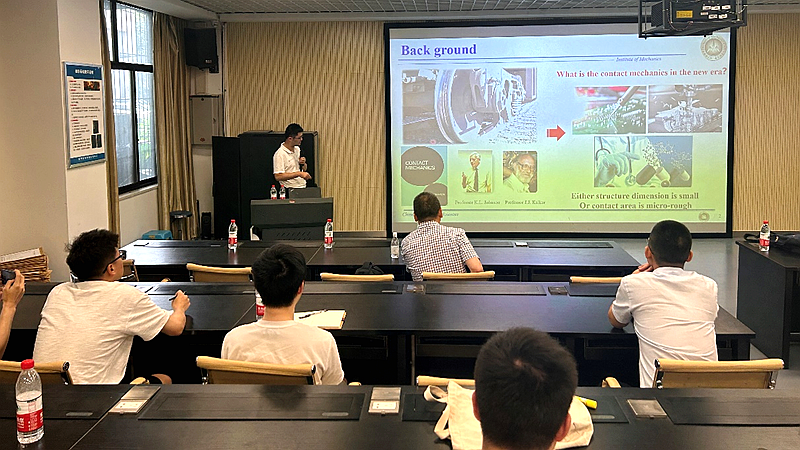 Borodich教授和金晓清教授代表学院对三位教授的到来表示欢迎,并对他们进行了简要介绍。Marian Wiercigroch院士目前任职于英国阿伯丁大学,他的研究专注于非线性动力学的理论研究、实验研究以及相关的工程应用。其在期刊和会议上发表了超过500篇论文,并担任IJMS的主编。此外,他还是iVDynamics Ltd的创始人和首席技术官,发明了“共振增强钻探”技术并获专利。宋恒旭教授是中国科学院力学研究所非线性力学国家重点实验室的副主任。他于2021年获得了中国国家自然科学基金委员会的优秀青年科学基金资助,现任中国科学院力学研究所正教授。他的研究涵盖了多个领域,包括小尺度塑性、接触力学以及数据挖掘和机器学习等。刘小明教授是中国科学院力学研究所先进材料跨尺度力学研究小组的负责人,他在2003年获得了西安交通大学的学士学位,在2009年获得了清华大学的硕士和博士学位,师从庄茁教授。随后,他与E. Van der Giessen教授合作,在荷兰的格罗宁根大学进行为期三年的博士后研究工作。2012年加入中国科学院,并开始领导先进材料跨尺度力学研究小组的工作。