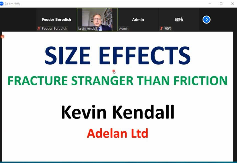 “力学交叉融合”全球前沿学科系列讲座第4期在线召开。本次讲座邀请固体力学学术名家Kevin Kendall教授为我院师生开展了主题为“Size effect: Fracture stranger than friction”的学术讲座。