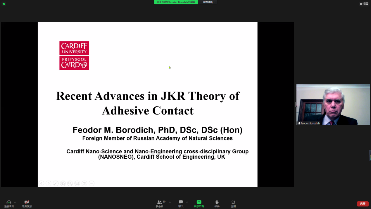 “力学交叉融合”全球前沿学科系列讲座第二期和第三期分别在线上召开。讲座分别邀请了俄罗斯科学院(RAS)外籍院士Fedor Borodich教授开展了主题为“Recent Advances in JKR Theory of Adhesive Contact”的学术讲座,以及Ivan Argatov教授开展了主题为“Indentation tomography: State-of-the-art in asymptotic modelling”的学术讲座。
